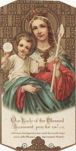 Ó Virgem Imaculada, Nossa Senhora do SSmo. Sacramento, que durante os anos que vivestes depois da Ascensão, fostes modelo perfeito de serviço à Divina Eucaristia: Vós que passáveis diante de Jesus Sacramentado os dias e as noites, consolando-vos assim no exílio, ensinai-nos a avaliar o tesouro que possuímos no Altar e inspirai-nos visitar frequentemente o SSmo. Sacramento no qual Jesus fica conosco para dirigir-nos, consolar-nos, proteger-nos e receber em troca as homenagens que Lhe são devidas por tantos títulos.